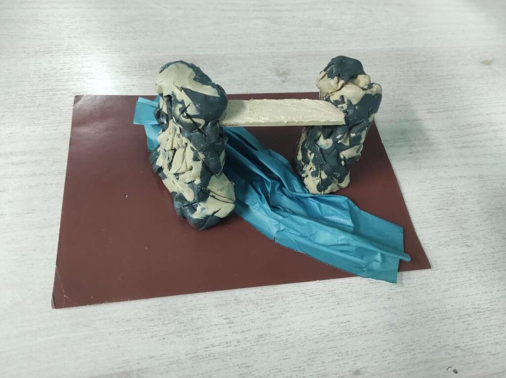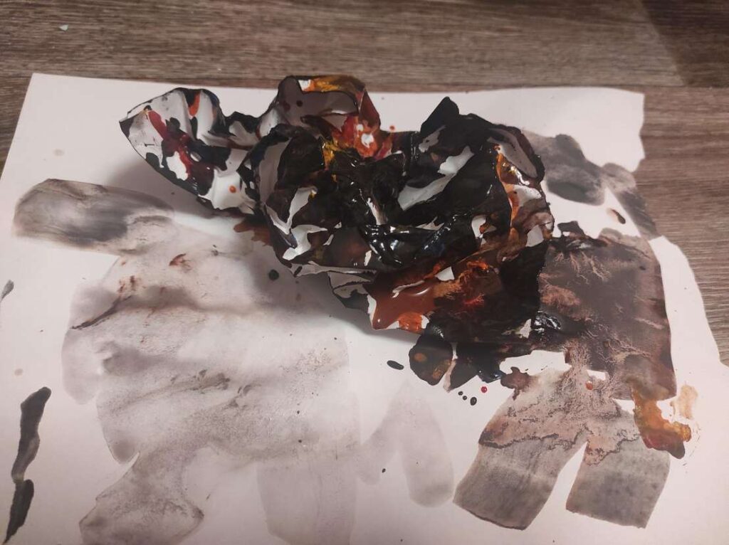 During our sessions with Ms. V, we explored her attitude towards herself and towards the life situation she was in. When we discussed it, Ms. V was cheerful and seemed generally happy. However, during a multimodal inquiry, she spontaneously created a twisted, crumpled, brown object. She was surprised herself and suddenly felt extremely negative towards her creation. This led her to realise that her cheerful attitude was just a surface, underneath which she had a lot of tension and disgust towards her life circumstances. Once this attitude surfaced, we could alternate between multimodal and verbal techniques to address both sides of her connection to reality. In our later sessions, Ms. V expanded her original creation, going beyond it and constructing a bridge towards a new world in which she would feel happier — in a sense, integrating the two conflicting sides of herself.